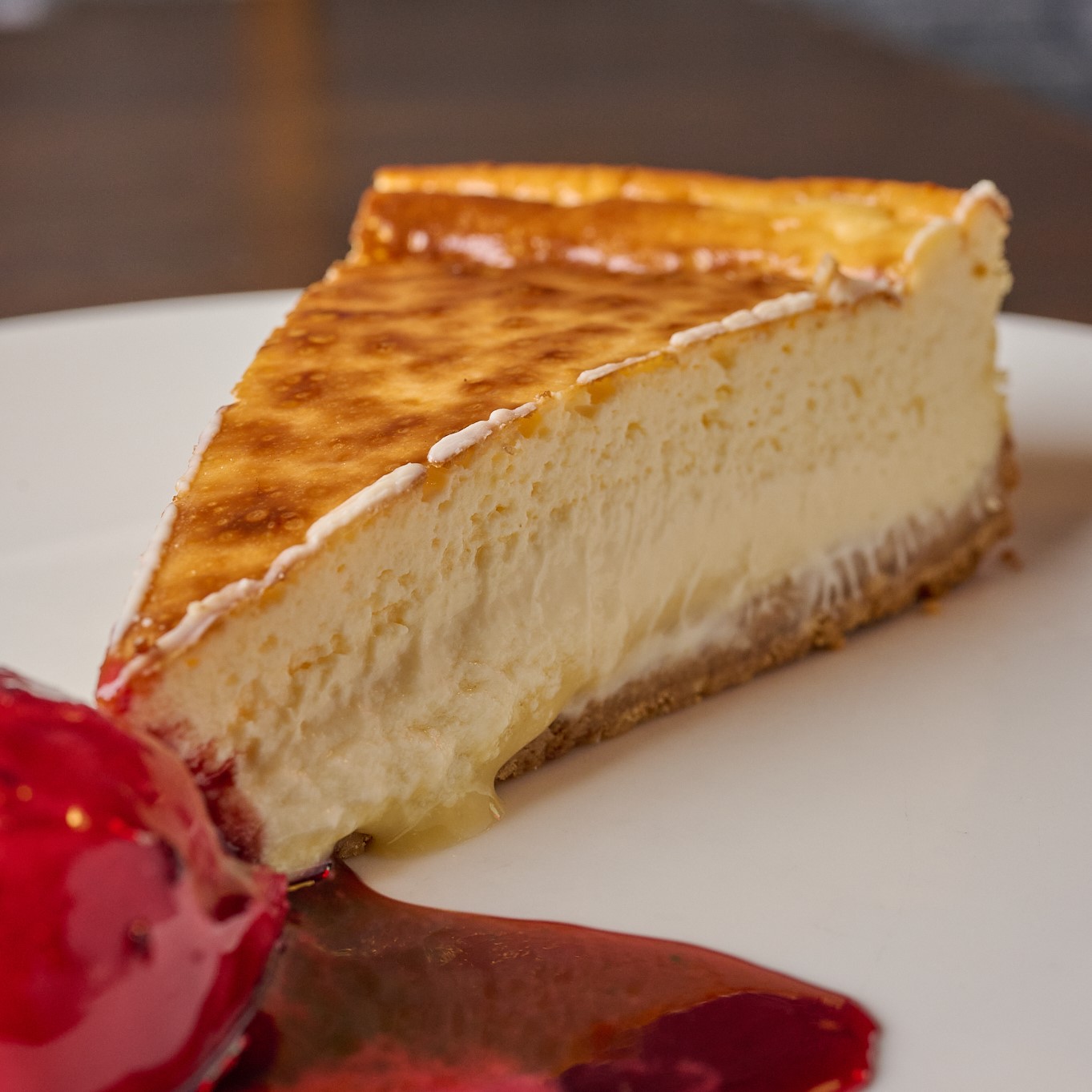 Tarta de queso casera con helado de yogur de frutos rojos.