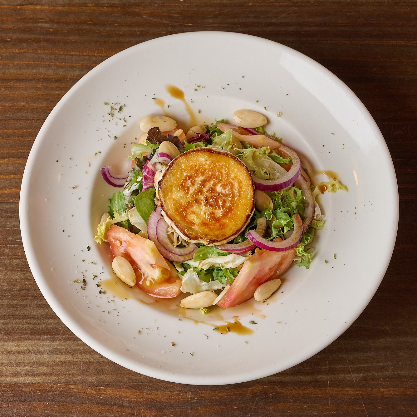 Queso de cabra, lechuga, tomate cherry, nueces, cebolla crujiente y miel.