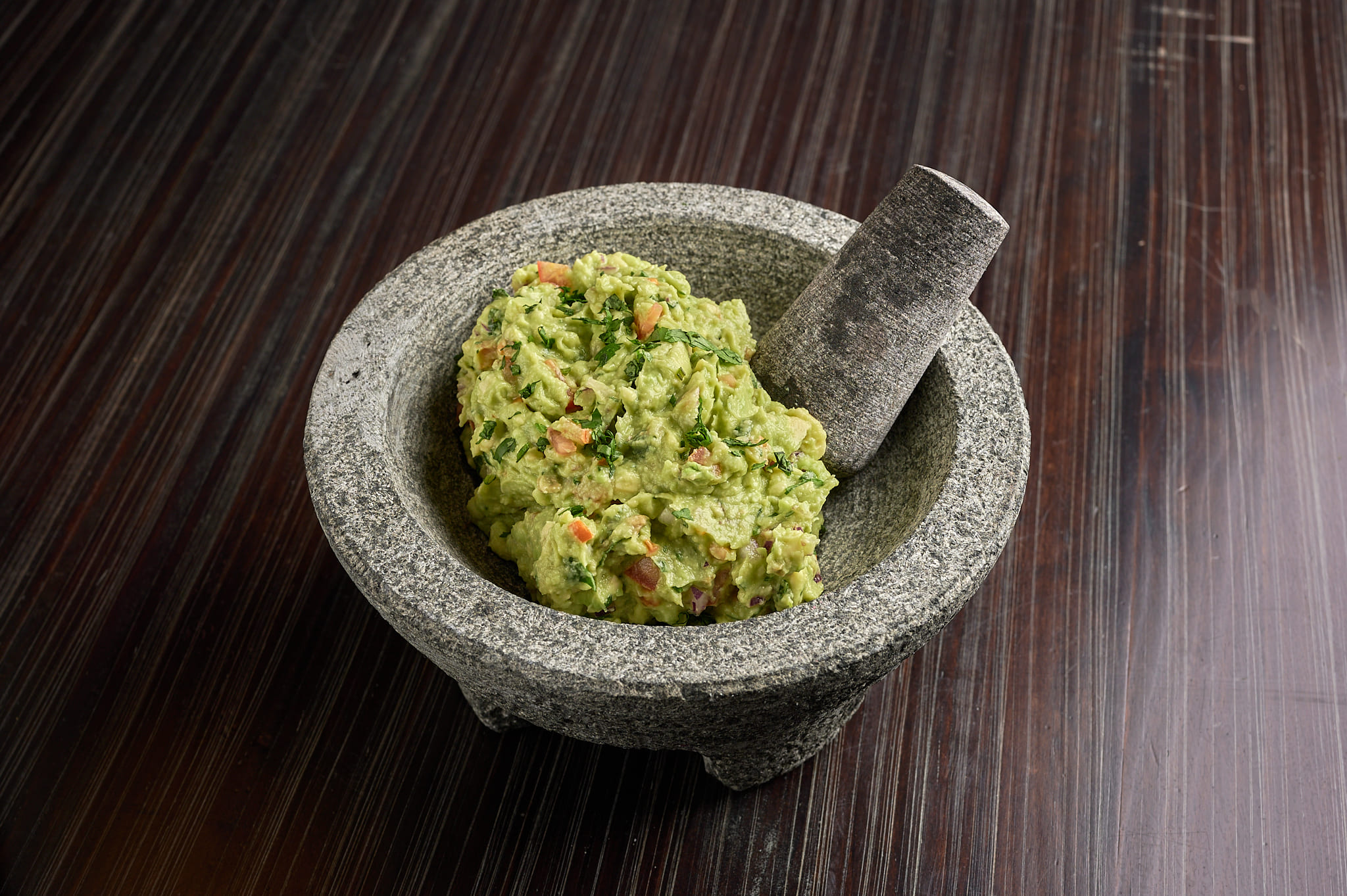 Nuestro Guacamole casero, con con tomate y cebolla fresca y picado y cilantro, con totopos de maíz caseros.