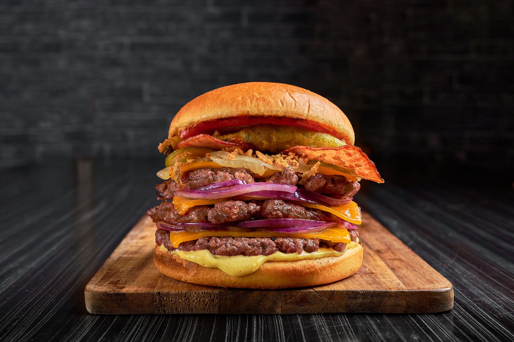 Triple de carne Smash, Cebolla caramelizada, Cebolla Ahumada, Cebolla fresca, Piparrras crujientes, Bacon crujiente, Salsa BB. Con pan brioche.